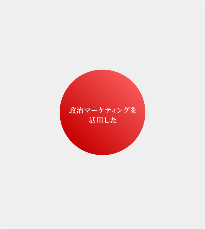政治と有権者の接点を顕在化→活性化し、政治への新しい参加・参入を増やすこと。これが、弊社が「政治マーケティング」の導入を通して果たす使命です。
